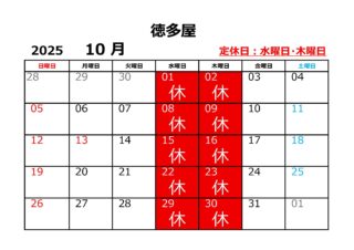 徳多屋駅前店の10月定休日のお知らせ