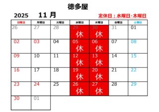 徳多屋駅前店の11月定休日のお知らせ