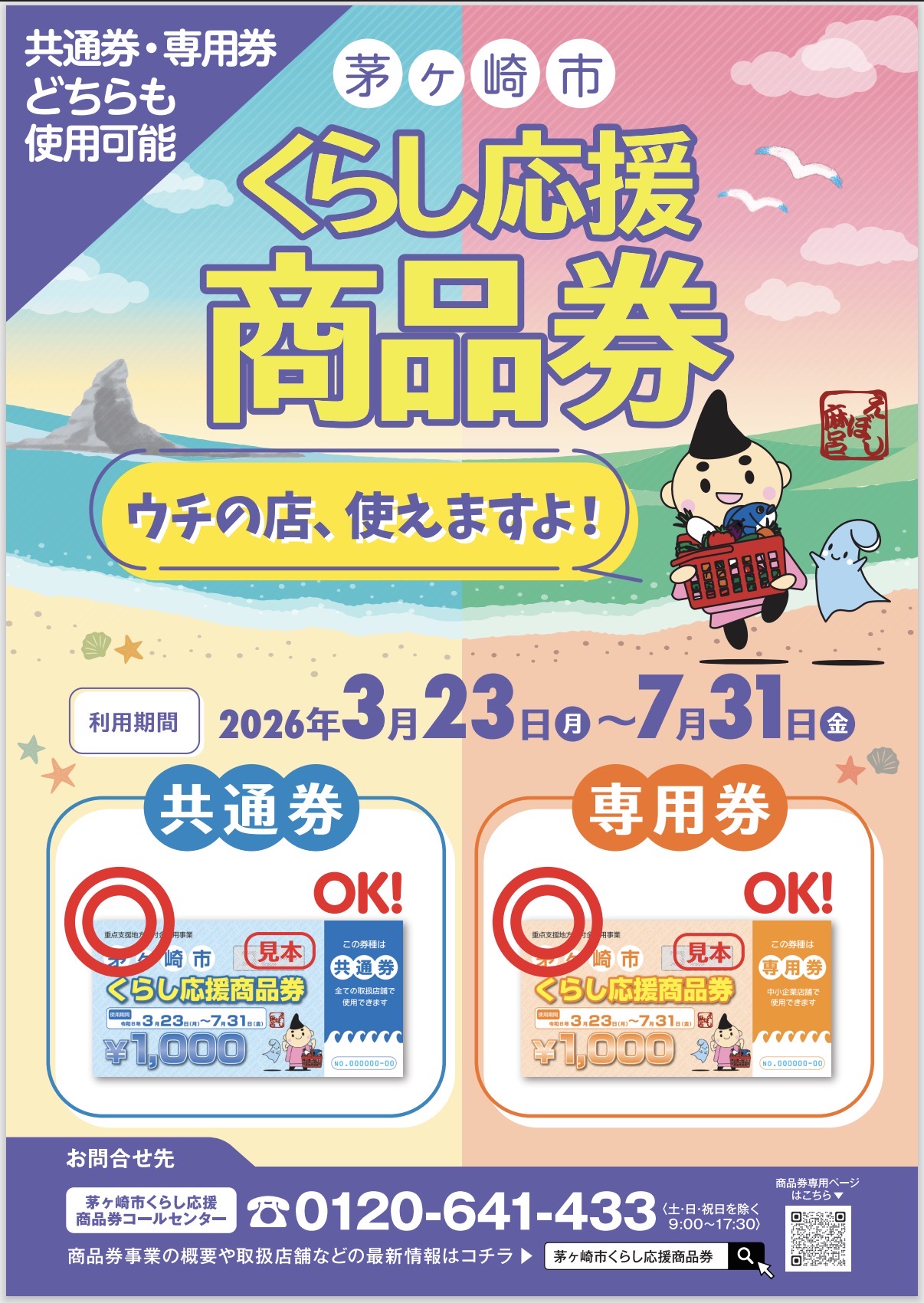 茅ヶ崎市が配布しております「茅ヶ崎市くらし応援商品券」は[専用券]・[共通券]ともにお使いいただけます。